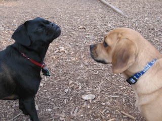 the Doggy Friends I met. I'm usually the shy puppy in the park because there are so many of them...especially big pups. I got to meet a new friend, Lola. Lola is a fellow Puggle and her and her mama were super nice to me. They are from Indiana. I also got to meet Goomba, a standard Poodle. My daddy especially liked him because he had a funny