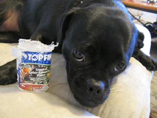 I said I was sorry and begged for Mama and Daddy to quickly go to the pet store to refill on One Fish's food, but they were not able to until three days later...One Fish starved for 3 whole days. I cannot imagine what that must have felt like. I love food too much to do that. I felt soooo guilty. Mama said that I was lucky to not get a bad tummy ache for eating the fish food. She and Daddy eventually forgave me and One Fish has his food now. Everybody is happy now, and they now have forgotten that I fulfilled a challenge and tried Fish Food. How many pups out there can say that they have done that?