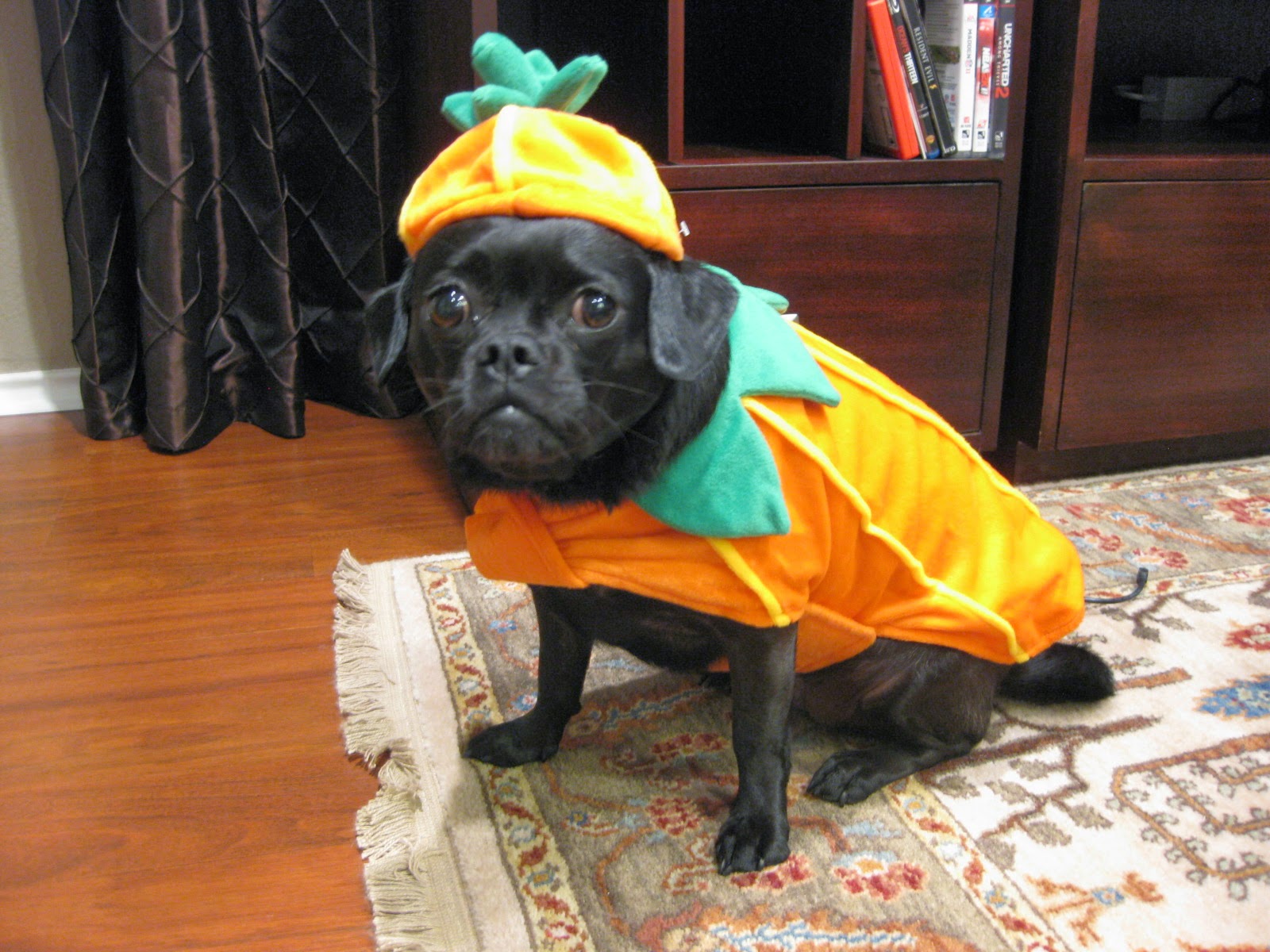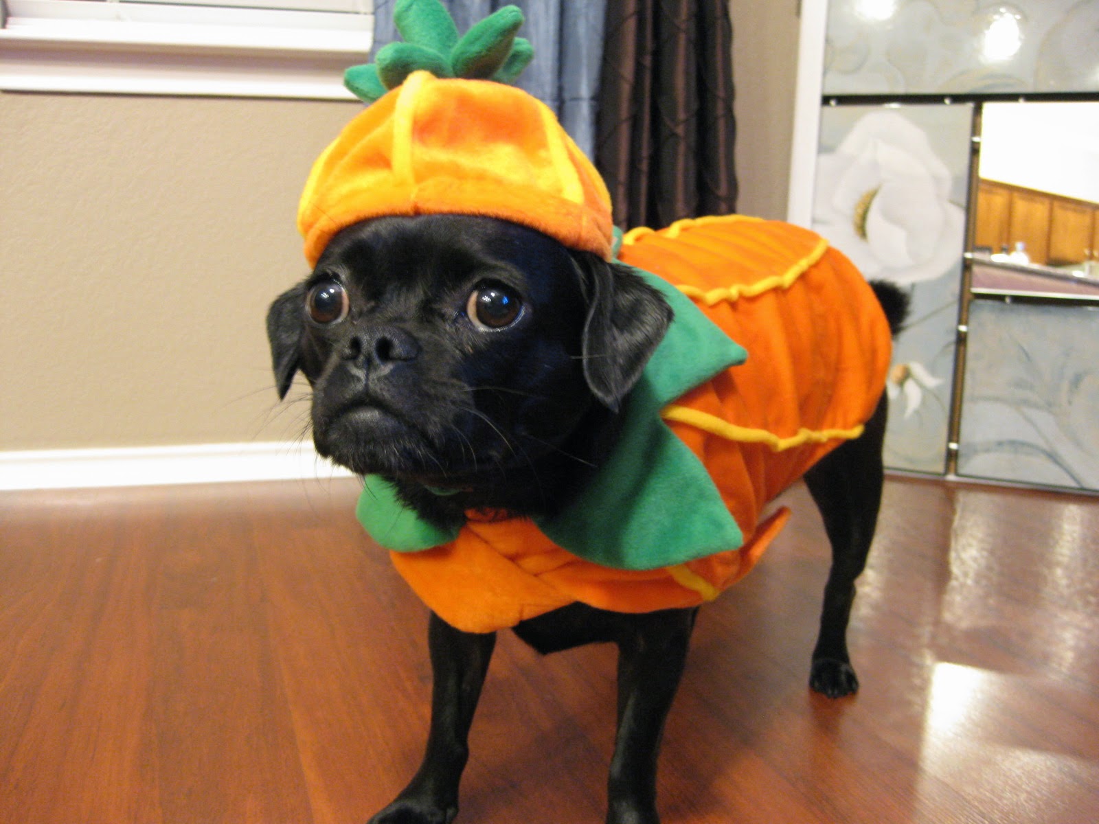 Okay, what kind of treats am I going to get for doing the awesome trick of wearing this pumpkin for all your humor? Trick-or-Treat! I would like a bone please!!!!